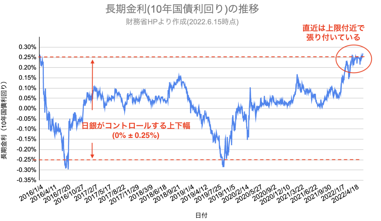 長期金利も日銀の金融政策によってコントロールされている点は同じですが、短期金利と異なるのは一定の変動幅が許容されている点です。図5の通り、長期金利は日銀によって0%からプラスマイナス0.25%の範囲で上下動が起こるため、海外(特にアメリカ)での金利が上昇する場合は、長期金利もその範囲内で高止まりしやすい(図6)のです。