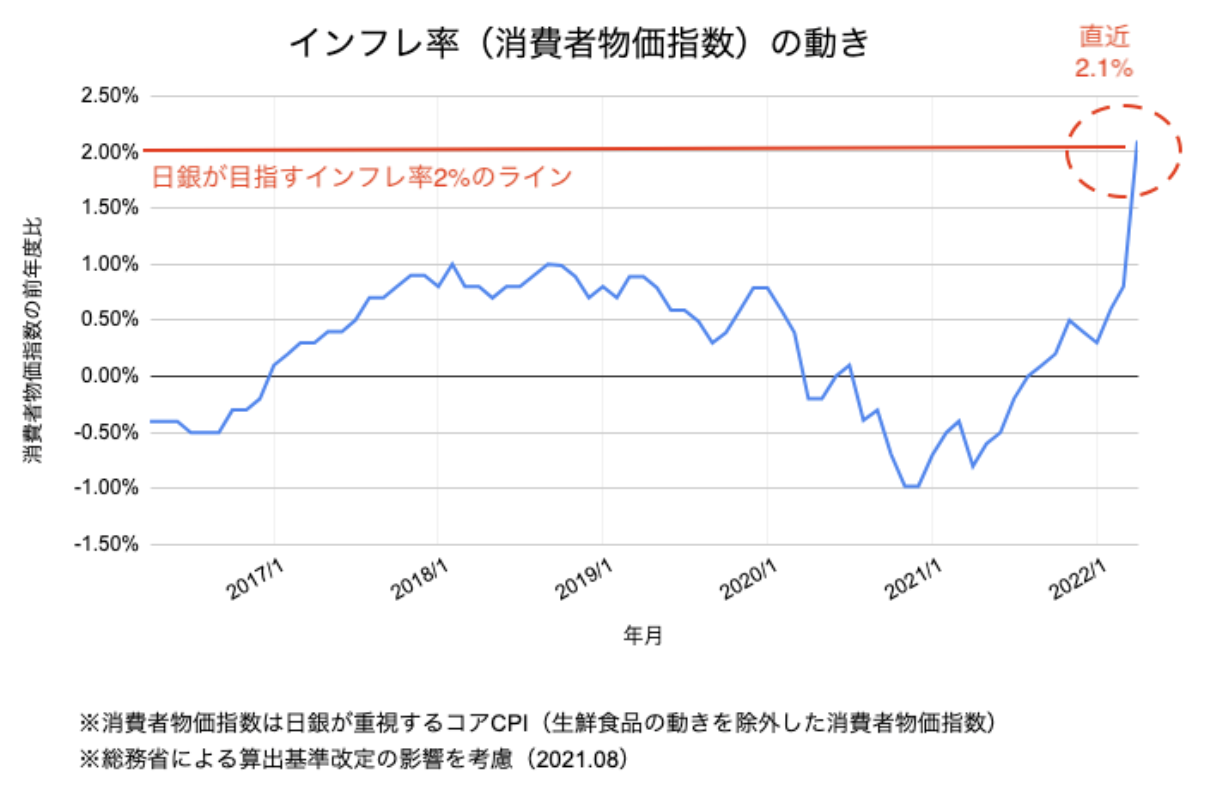 現在はウクライナ情勢の影響からガソリン価格や食料品価格が大きく上がっており、直近のインフレ率は2%をわずかに上回っています(図3)。
