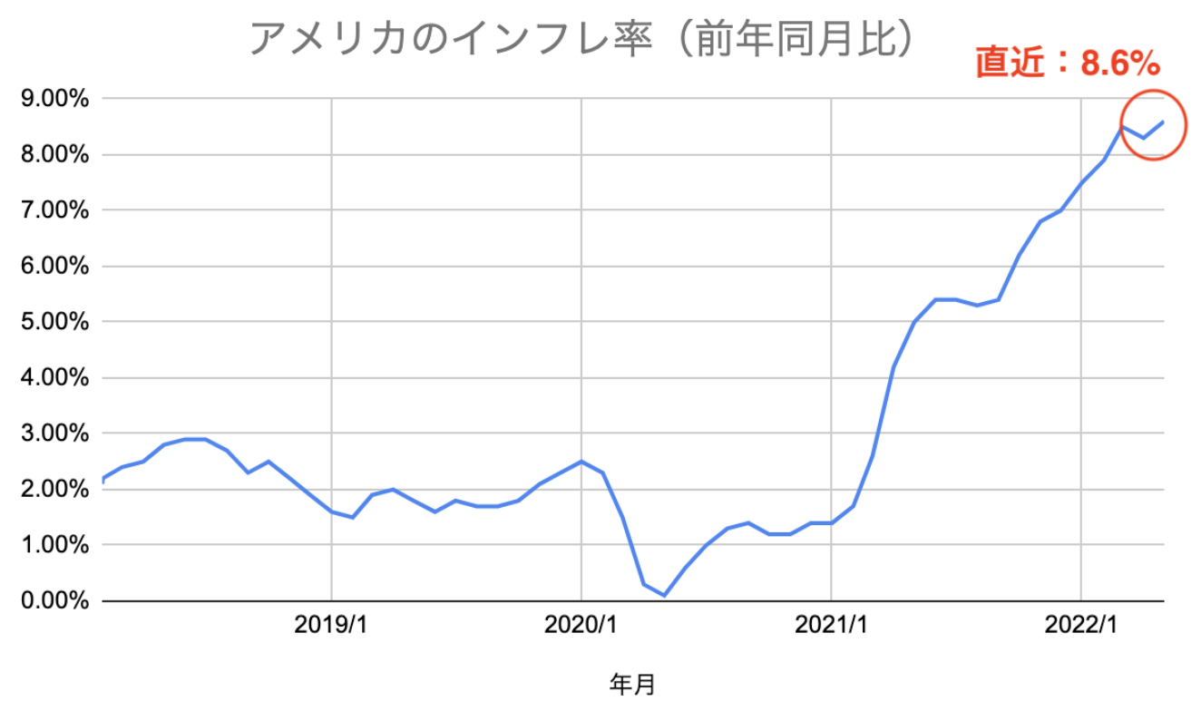 現在アメリカのインフレ率は8.6%とここ30年ほどで最も高い水準になっており、政策金利を上げることでインフレ沈静化に動いているのです。