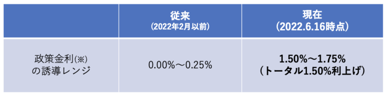 ※アメリカの金融政策は、政策金利であるFF金利(Federal Fund Rate)を誘導するレンジ(幅)をコントロールする形で運営されています。従来はFF金利が「0%から0.25%に収まるように運営」されていましたが、利上げによって0.75%〜1.00%へのレンジに変更されています。