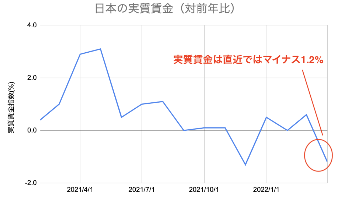 一方で肝心の賃金は、直近はマイナス1.2%とむしろ低下しています(図4)。