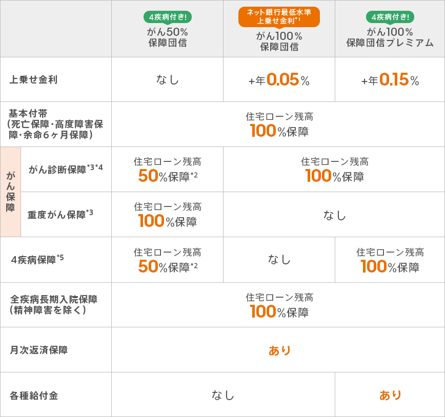・PayPay銀行:がん50%保障団信→+0.05%、がん100%保障団信→+0.15%と低い上乗せ金利で提供(2025年6月)