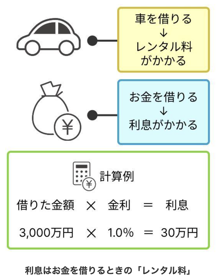 例えると、車や会議室を借りるとレンタル料がかかるように、お金を借りるときにもレンタル料が発生します。このレンタル料を利息といいます。