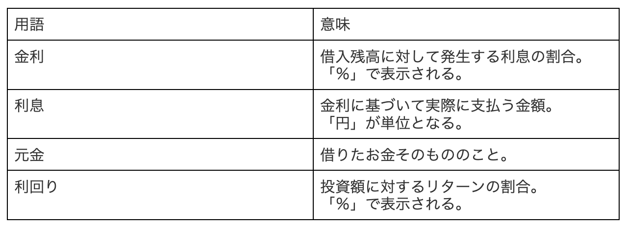 住宅ローンの話では、「金利」「利息」「元金」「利回り」といった言葉が出てきます。