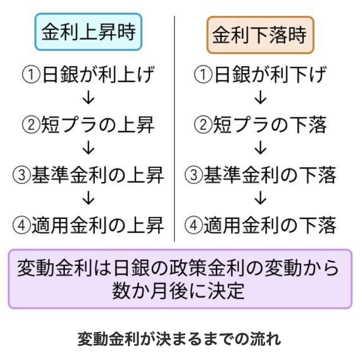 なお、変動金利の基準金利は、銀行が信用力が高い企業に短期融資をするときに用いる「短期プライムレート」(短プラ)に連動します。