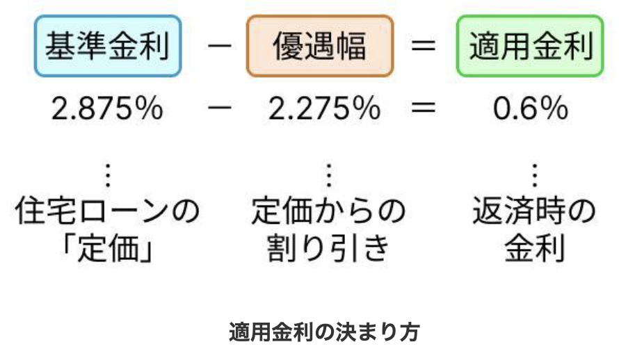 たとえば、基準金利2.875%・優遇幅2.275%のときの適用金利は、「2.875% - 2.275% = 0.6%」となります。