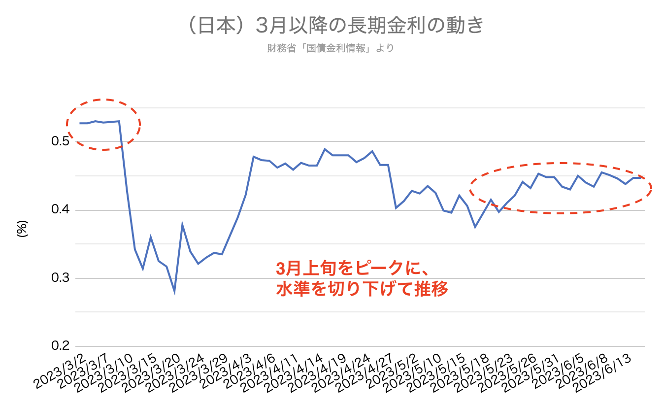 長期金利は3月上旬に0.5%付近で推移していたのをピークに、その後は水準を切り下げて0.4%付近で推移しています。この間には欧米銀行の倒産・経営不安や、金融経済の中心地・アメリカでの利上げの打ち止めがありました。アメリカの中央銀行であるFRBは今後追加利上げを行う構えではあるものの、金融市場では将来的にマイルドな景気後退入りや金融緩和への転換を見込む声も出ています。こうした状況から、日本もアメリカも長期金利に上昇圧力がかかる状況ではなくなっています。
