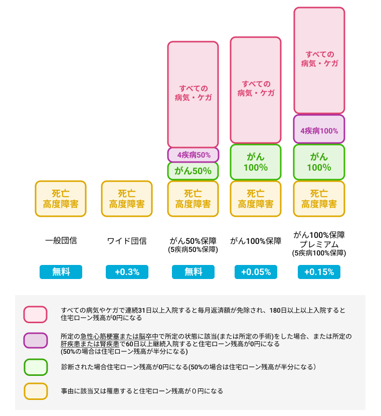 一般団信 ワイド団信 がん50%保障+4疾病50%保障+全疾病保障 がん100%保障+全疾病保障 がん100%保障プレミアム(がん100%保障+4疾病100%保障+全疾病保障) |
