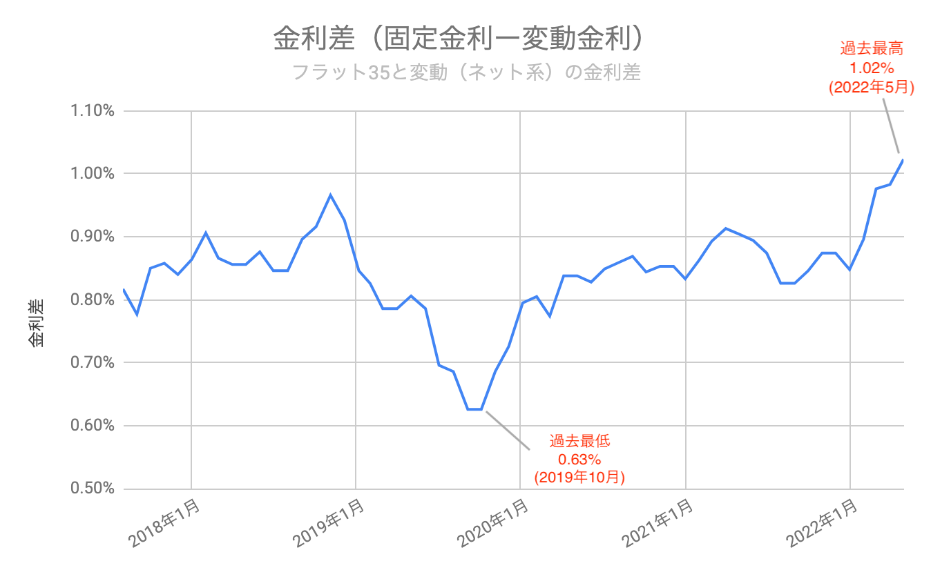 変動金利が低下する一方で固定金利が上昇していることで、この金利差も拡大しています。