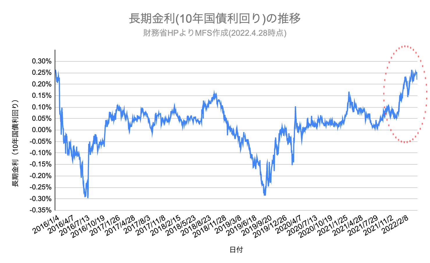 背景には、金融市場の中心地であるアメリカでのインフレ(物価上昇)と、インフレ激化を防ぐための金融政策の引き締め(利上げ)があります。これによって2021年末頃からアメリカでは金利の上昇傾向が強まっており、その煽りを受けて日本の長期金利も上昇しています。