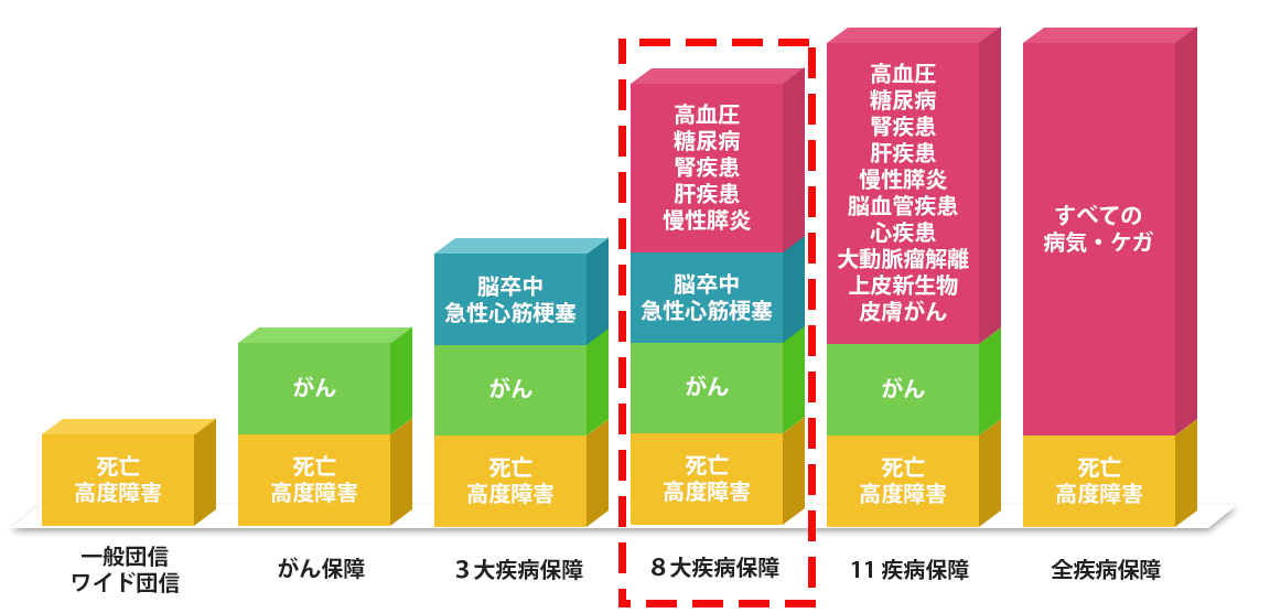 8大疾病保障は、一般団信、がん保障、3大疾病保障が全て含まれ、それに加えて5つの重度慢性疾患をカバーする非常に守備範囲の広い保険です。