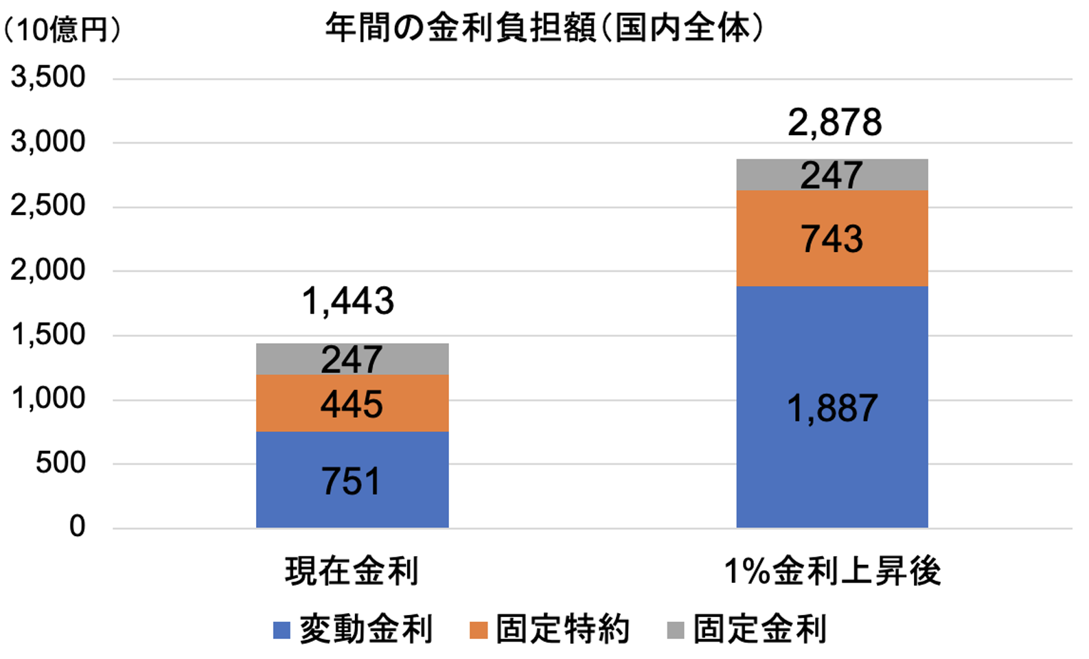 年間で1.4兆円の金利負担となり、変動金利は7,510億円と半分以上を占めます。仮に金利が1%上昇した場合、変動金利は金利負担額が0.8兆円から1.9兆円に増え、全金利種別の合計値も2.9兆円(※3)と倍増しました。