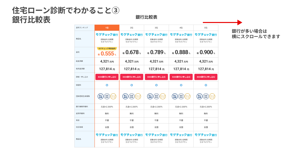 おすすめの銀行を「金利」や「団信(団体信用生命保険)」などの項目ごとに横並びで比較できます。