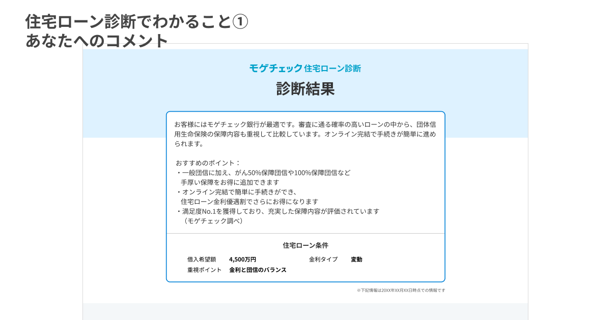 今回は、モゲチェック住宅ローン診断の「診断結果画面でわかること」について解説しました。