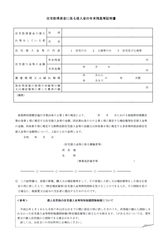 住宅取得資金に係る借入金の年末残高等証明書(残高証明書) |