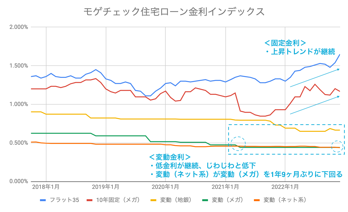 変動金利で低下傾向が続く一方、固定金利は上昇トレンドが続いています。