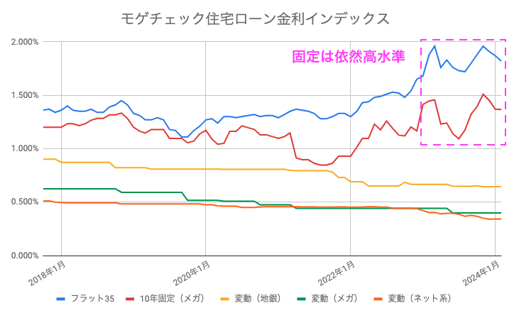 結果として、平均的には固定金利はやや低下という程度に留まり、変動金利・固定金利の差はさほど埋まっていません。金利水準の高い固定金利で金利上昇リスクをヘッジする理由は乏しく、変動金利の利用が優位であるとモゲチェックでは考えています。