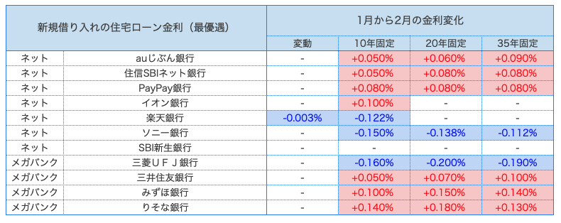 | 金融機関 | ローン名 | 2024年1月 | 2024年2月 | 差 |