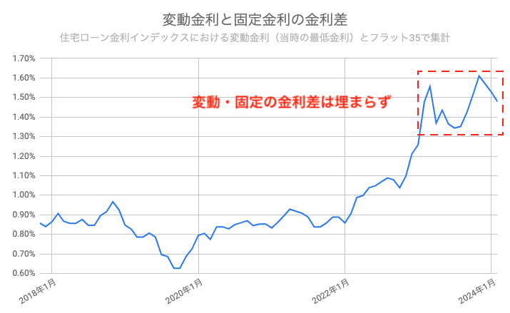 上述の金利インデックスから、最安の変動金利とフラット35の金利差をとったグラフが以下です。今月は変動金利も固定金利も低下したためやや縮小したものの、依然として1.48%と大きな金利差となっています。これは毎月返済額で約2.4万円、総返済額で約1,020万円もの差がつく計算となります(借入額3,500万円、35年返済の場合)。