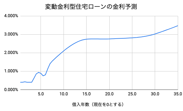 このグラフからは、変動金利は35年後に向けて3%付近まで上昇する可能性があると読み取れます。ただし、流動性の高い日本国債の利回りからこの予測を行っていることから、今後の金融市況や景気動向によって大きく変化する可能性もあります。将来の金融政策や国内外の景気変動の影響を大きく受けるため、あくまで参考程度と捉えておくのがいいでしょう。