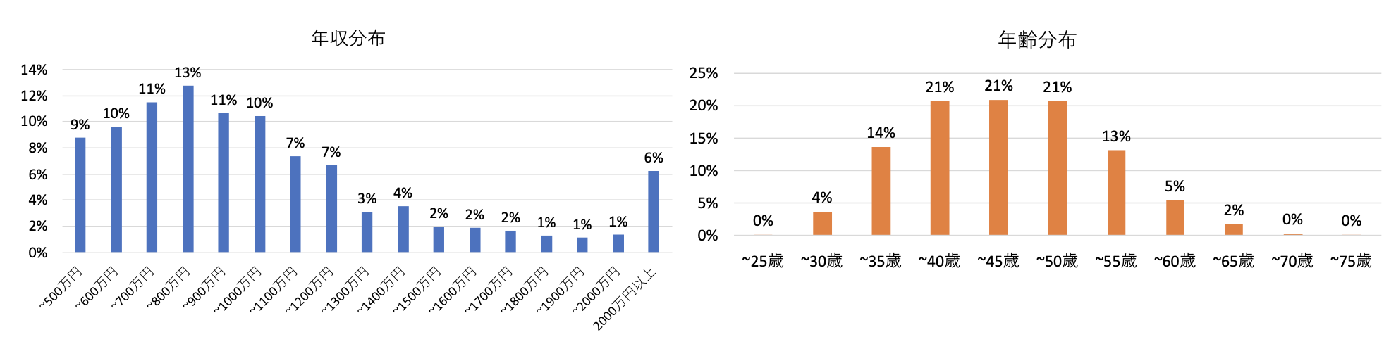 「モゲチェック不動産投資(借り換えサービス、バウチャーサービス)」を利用するユーザーの平均年収は1,064万円、最多年収層は700万円台でした。不動産投資を行う際には銀行借り入れを行うのが一般的であり、その審査基準に合致する高所得者が中心ユーザーになっているものと推測されます。また平均年齢は43歳となりましたが、20代のユーザーも少なからず存在し、全体の4%を占めています。