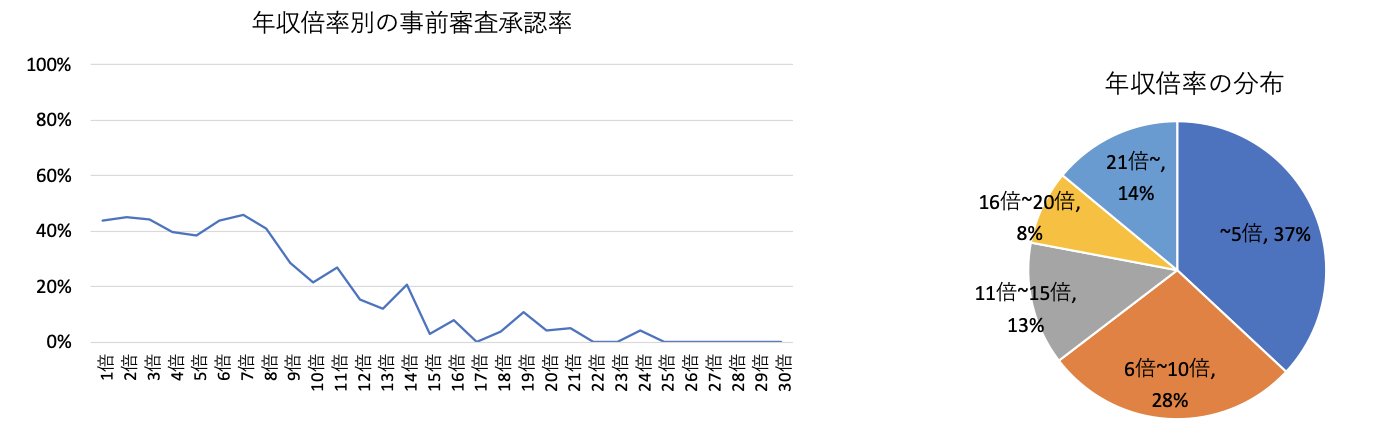 否決の原因を分析したところ、年収倍率(ローン残高と年収の比率)が15倍を超える借り入れを行なっているユーザーは承認率がほぼ0%になることがわかりました。また、年収倍率が8倍以下であれば承認率は40%程度になり、8倍までは年収倍率が下がるほど借り換えができるユーザーの割合も増える傾向にありました。年収倍率が高いということは、年収や資産状況に見合わない、自身のリスク許容度を超える不動産投資ローンを借りている可能性が高くなり、審査に通らなくなる実態が垣間見えます。