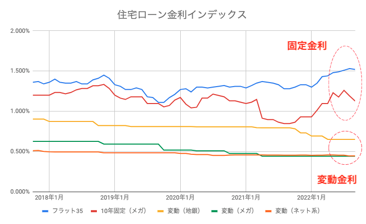 主要なネット銀行、メガバンク、地方銀行の変動金利、メガバンクの10年固定金利、フラット35の金利をそれぞれ平均した、住宅ローン金利インデックスの動きは下図の通りです。