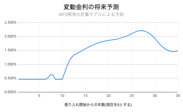 このグラフから、変動金利は今から10年後頃から徐々に上昇し、最大2%超まで上昇した後に低下する可能性があると読み取れますが、少なくとも向こう10年程度は大きな変化なく低金利が続くという予測になっています。