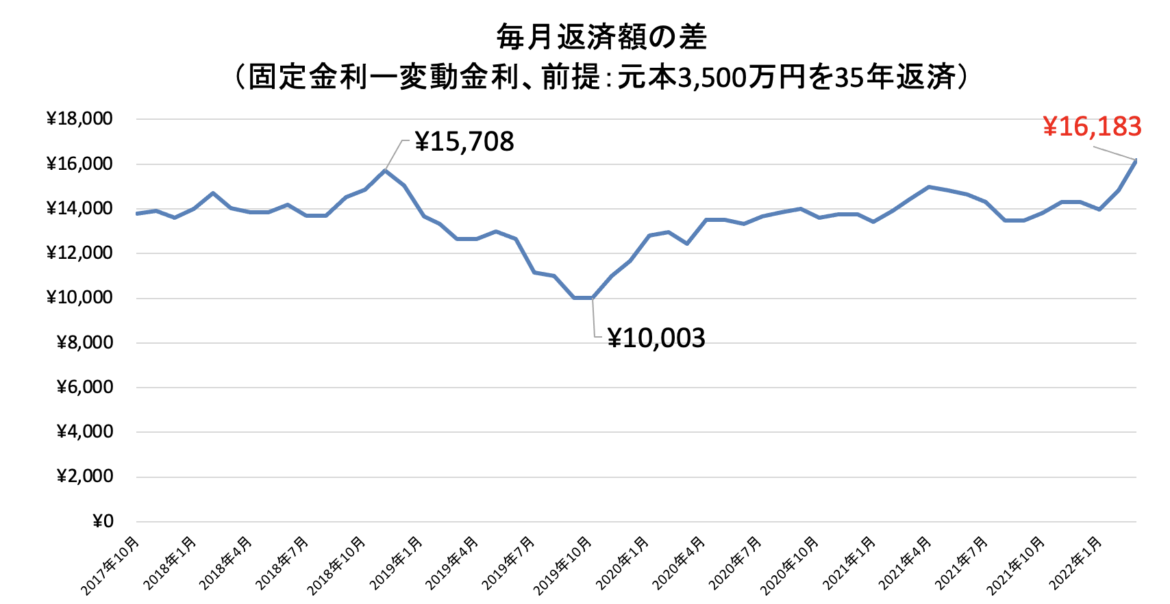 この金利差を毎月返済額の差に置き換えたグラフが下記です。元本3,500万円前提では変動金利の毎月返済額は9万円、固定金利が10.6万円となります。結果、毎月返済額の差は1.6万円まで拡大しています。