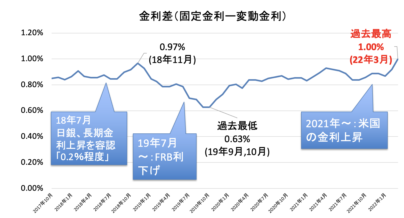 この金利変動により、固定金利と変動金利の金利差は過去最大となり、1%を記録しました。これは2018年7月に日銀が長期金利上昇を0.2%まで許容し、11月に金利差が0.97%を記録した水準を超えて過去最大です。