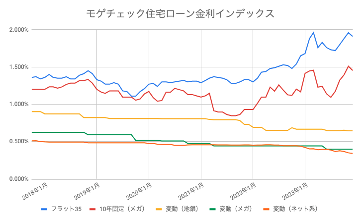 主要なネット銀行、メガバンク、地方銀行の変動金利、メガバンクの10年固定金利、フラット35の金利をそれぞれ平均したモゲチェックの独自指標、「住宅ローン金利インデックス」の動きは下図の通りです。