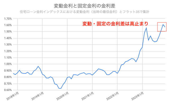 上述の金利インデックスから、最安の変動金利とフラット35の金利差をとったグラフが以下です。今月は変動金利も固定金利も低下したためやや縮小したものの、依然として1.57%と大きな金利差となっています。これは毎月返済額で約2.6万円、総返済額で約1,100万円もの差がつく計算となります(借入額3,500万円、35年返済の場合)。