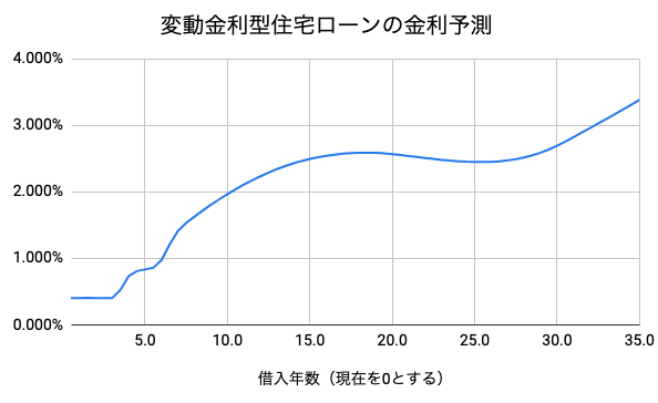このグラフからは、変動金利は35年後に向けて3%付近まで上昇する可能性があると読み取れます。ただし、流動性の高い日本国債の利回りからこの予測を行っていることから、今後の金融市況や景気動向によって大きく変化する可能性もあります。将来の金融政策や国内外の景気変動の影響を大きく受けるため、あくまで参考程度と捉えておくのがいいでしょう。