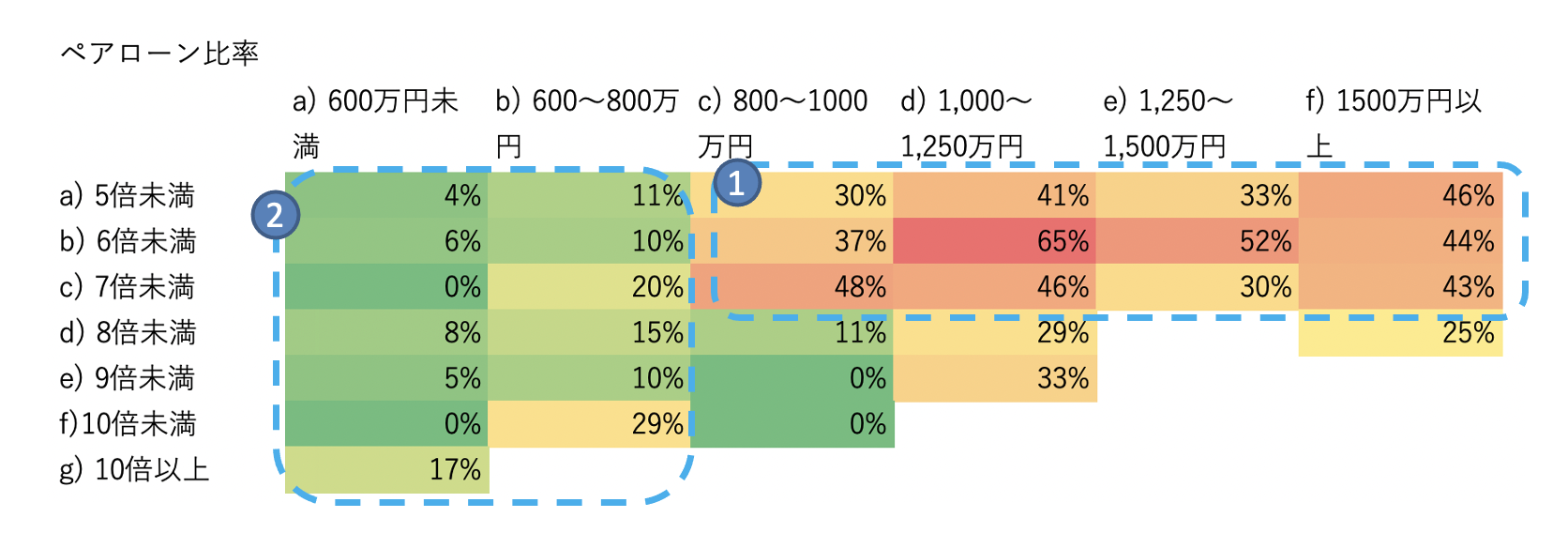 先ほどの年収☓年収倍率の表にペアローン比率を記載したのが下の表です。ペアローン比率が高いのは赤い箇所(①)で、高年収かつ年収倍率が低いゾーンですね。①に該当するユーザーはペアローンを組まなくても物件購入できますので、ペアローン利用は別の理由が考えられます。それは、税控除と配偶者による物件の持ち分取得です。