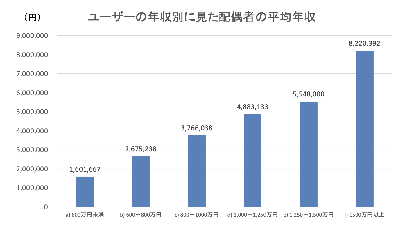 一方、年収800万円未満の層(②)は全般的にペアローン比率が低いです。特に600万円未満の層ではほとんど利用がありません。おそらく、配偶者の年収や勤務形態がペアローンの審査要件を満たさない人が多いためと考えられます。実際、上のグラフの通り、夫婦の年収は比例傾向にあります。また、②の中でペアローン比率が高いのは年収倍率が10倍付近のユーザーです。ここはまさに債務者一人では買えない物件を”背伸び”して買うためにペアローンにしていると考えられます。