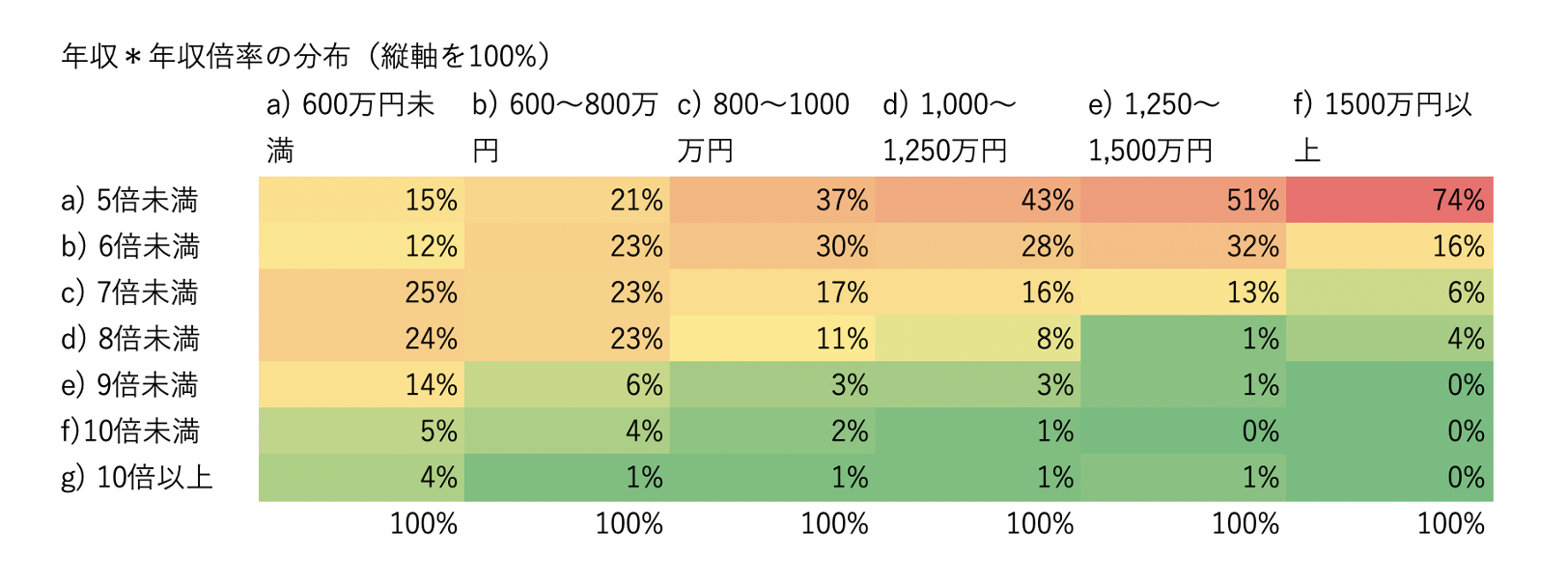なお、その高年収層ですが、物件購入については堅実派のようです。下の表は東京在住のモゲチェックユーザー862名を対象に、年収(主債務者のみ、配偶者は含まず。)を横軸に、年収倍率※を縦軸に取ったものです。縦の合計を100%とし、各年収倍率に当てはまる人数を%で表示しています。%が高いほど赤に、低いと緑で表示しています。