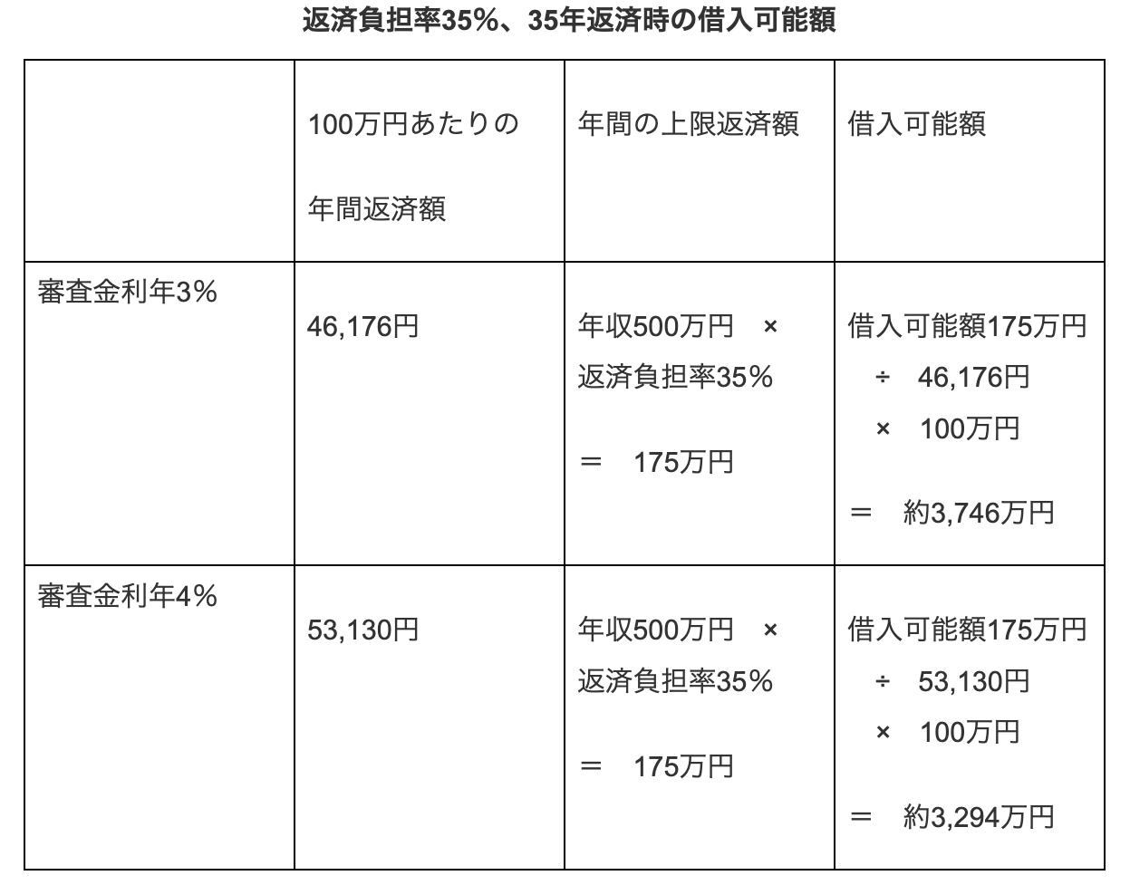 ここでは、借入期間35年・返済負担率35%・審査金利4.0%という比較的厳しい条件での借入可能額と、適用金利1.0%での毎月返済額の早見表を掲載しました。